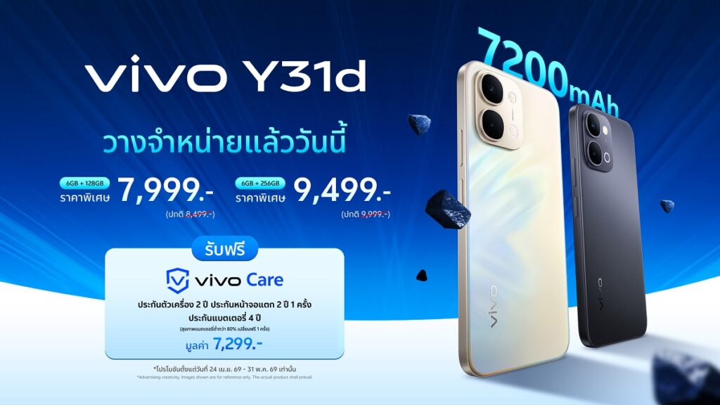 vivo แบรนด์สมาร์ตโฟนชั้นนำระดับโลก เปิดตัว vivo Y31d สมาร์ตโฟนน้องเล็กรุ่นใหม่ล่าสุดจากตระกูล Y seriesเข้ามาเป็นอีกหนึ่งทางเลือกสำหรับผู้ใช้งานที่มองหาสมาร์ตโฟนที่ผสานความทนทานและความคุ้มค่าไว้ในเครื่องเดียว ออกแบบมาเพื่อรองรับการใช้งานในชีวิตประจำวันได้อย่างมั่นใจ มาพร้อมกับแบตเตอรี่ BlueVolt ความจุสูงถึง 7200mAh ใช้งานได้ยาวนานตลอดวัน พร้อมรองรับ ชาร์จไว 44W และ Bypass Charging ให้ใช้งานได้ต่อเนื่องไม่มีสะดุด ขับเคลื่อนด้วยชิป Snapdragon® 6s Gen 2 (4G) ให้การใช้งานลื่นไหล พร้อมช่วยประหยัดพลังงานมากขึ้น เสริมประสบการณ์ความบันเทิงด้วยหน้าจอขนาดใหญ่ 6.75 นิ้ว รีเฟรชเรต 120Hz และลำโพงสเตอริโอคู่ที่เพิ่มระดับเสียงได้สูงสุดถึง 400% ให้เต็มอิ่มทุกการรับชม มั่นใจยิ่งขึ้นด้วยมาตรฐานทนน้ำทนฝุ่น IP68 และ IP69 และโครงสร้างกันกระแทกรอบด้าน รองรับทุกสถานการณ์ในชีวิตประจำวัน วางจำหน่ายในประเทศไทยแล้วตั้งแต่วันนี้ ในราคาเริ่มต้นเพียง 7,999 บาท