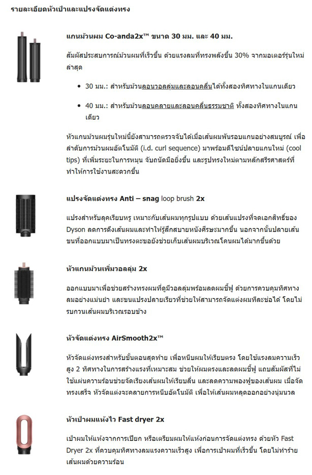 ผลิตภัณฑ์มาพร้อมหัวจัดแต่งทรง 6 ชิ้นในกล่องดีไซน์เฉพาะจาก Dyson หัวเป่าอันหลากหลายทำให้สามารถจัดแต่งทรงผมได้หลากหลายตามต้องการ ไม่ว่าจะมีสภาพเส้นผมแบบใด หัวต่อแต่ละชิ้นมาพร้อมเทคโนโลยีควบคุมแรงลมอย่างชาญฉลาด รองรับแรงลมที่สองเท่าจากมอเตอร์ Dyson Hyperdymium™2 รุ่นใหม่ล่าสุด