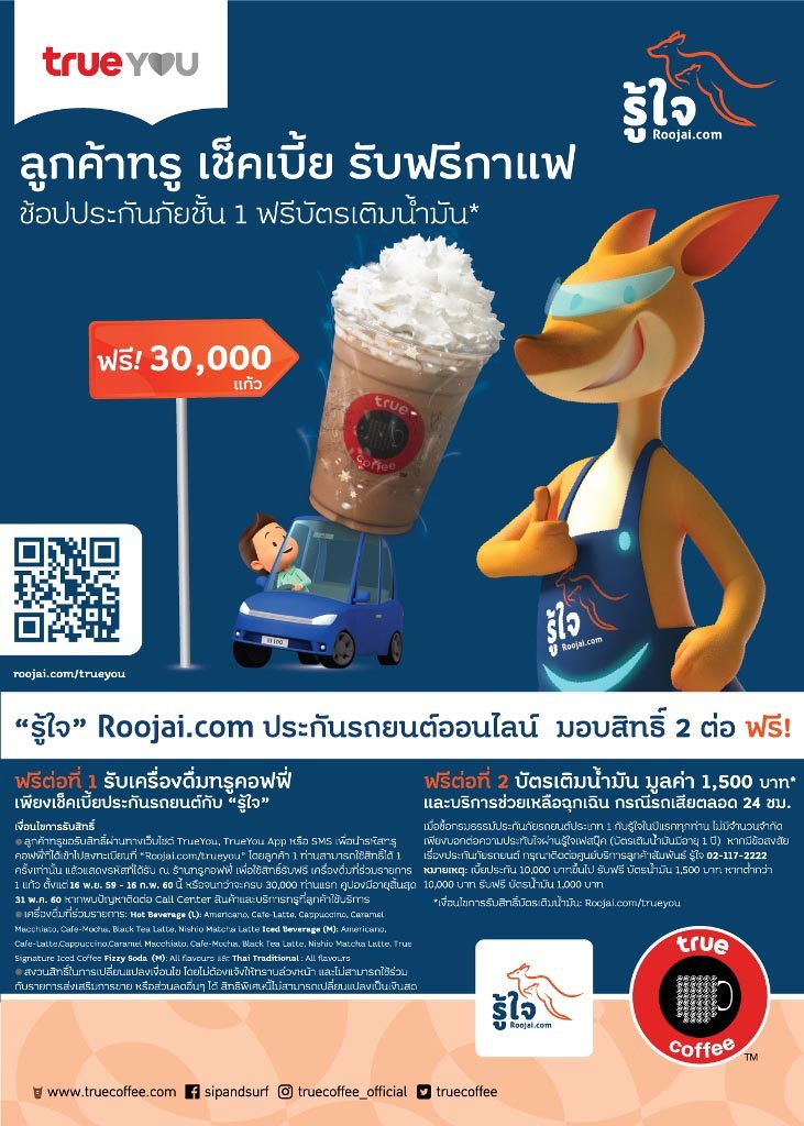 นอกจากนี้รู้ใจยังร่วมมือกับบริษัทยักษ์ใหญ่ของผู้ให้บริการอินเตอร์เน็ตและโทรศัพท์เคลื่อนที่ทรู โดยมอบสิทธิ์ให้กับลูกค้าทรูที่ช้อปประกันชั้น 1 กับรู้ใจในปีแรก รับฟรี บัตรเติมน้ำมัน มูลค่าสูงสุด 1,500 บาท* พร้อมบริการช่วยเหลือฉุกเฉิน กรณีรถเสียตลอด 24 ชม. ผ่านทางเว็บไซต์ www.roojai.com/trueyou โดยลูกค้าทรูสามารถรับโค๊ดได้ทางแอพพลิเคชั่น TrueYou หรือ กด *878*3328# โทรออก (ฟรี) โดยงานนี้ เพียงลูกค้าทรูที่สนใจเช็คเบี้ยประกันรถกับรู้ใจ ยังได้รับสิทธิ์รับกาแฟทรูคอฟฟรี่รสยอดนิยมฟรี ทั้ง 102 สาขาของทรูคอฟฟพี่ ทั่วประเทศไทยอีกด้วย
