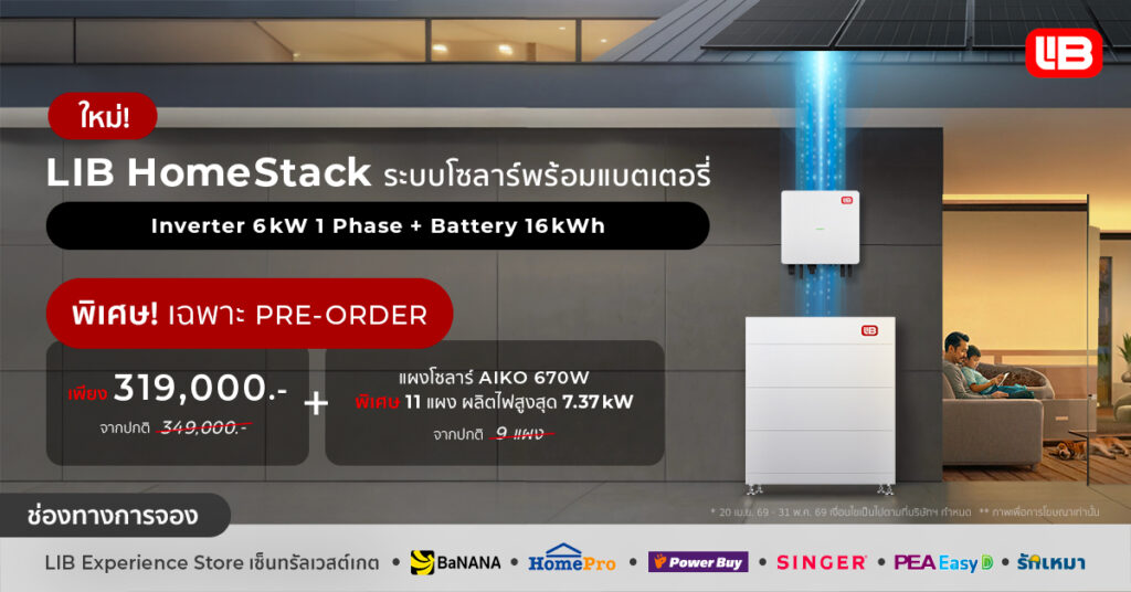 EnergyLIB เปิดพรีออเดอร์ LIB HomeStack ระบบโซลาร์ที่มาพร้อมอินเวอร์เตอร์ขนาด 6kW 1 Phase และแบตเตอรี่ขนาด 16kWh ได้ตั้งแต่วันที่ 20 เมษายน – 31 พฤษภาคม 2569 ราคาพิเศษเพียง 319,000 บาท จากปกติ 349,000 บาท และพิเศษแผงโซลาร์ 670W จำนวน 11 แผง มอบกำลังการผลิตไฟรวมสูงสุด 7.37kW จากปกติ 9 แผง โดยรวมทั้งบริการติดตั้งพื้นฐาน[3] รับประกัน[4] และบริการหลังการขาย ครบจบในที่เดียว พร้อมสามารถใช้สิทธิ์ลดหย่อนภาษีได้สูงสุด 200,000 บาท ตามเงื่อนไขที่กำหนด ที่ LIB Experience Store สาขาเซ็นทรัล เวสต์เกต ชั้น 2 รวมถึง BaNANA, HomePro, Power Buy, SINGER, PEA, รักเหมา และตัวแทนจำหน่ายที่ร่วมรายการทั่วประเทศ