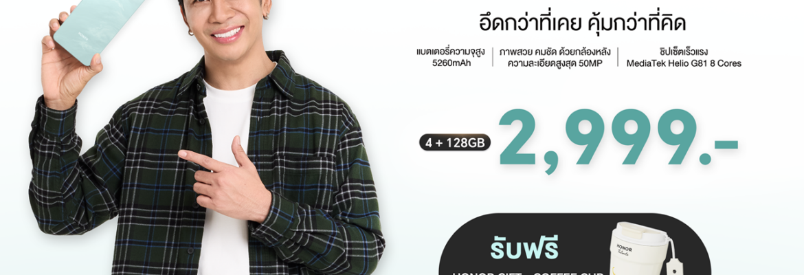 HONOR X5c Plus ราคา 2,999 บาท มี 2 สี ได้แก่ สี Meteor Silver และ สี Ocean Cyan รับโปรโมชันพิเศษเมื่อซื้อ HONOR X5c Plus รับฟรี HONOR Gift – Coffee Cup มูลค่า 299 บาท ตั้งแต่วันที่ 23 มกราคม 2569 ถึงวันที่ 28 กุมภาพันธ์ 2569 หรือจนกว่าของแถมจะหมด จำหน่ายที่ HONOR Experience Store ทุกสาขา และร้านค้าตัวแทนจำหน่ายทั่วประเทศ หรือ https://url.in.th/yKDRs