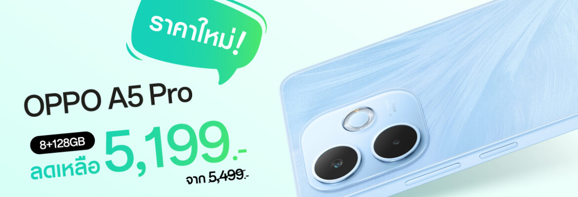 6 ตุลาคม กรุงเทพฯ – OPPO A5 Pro สมาร์ตโฟนสวย ครบ จบทุกดาเมจจากตระกูลซีรีส์ A สมาร์ตโฟนที่สุดของความทนทาน OPPO A5 Pro (8+128GB) มาพร้อมราคาใหม่สุดพิเศษ ลดเหลือเพียง 5,199 บาท จากราคาปกติ 5,499 บาท ตั้งแต่วันนี้เป็นต้นไป