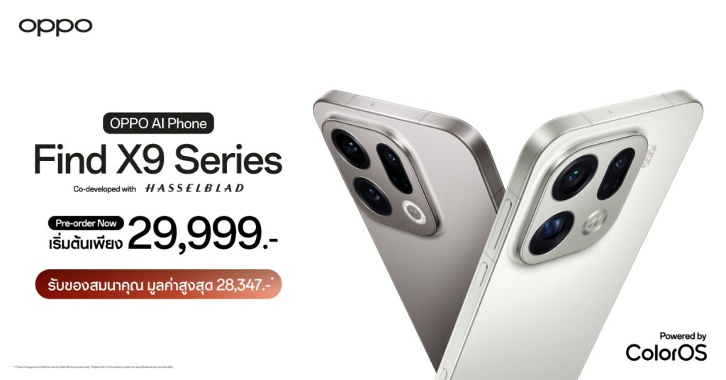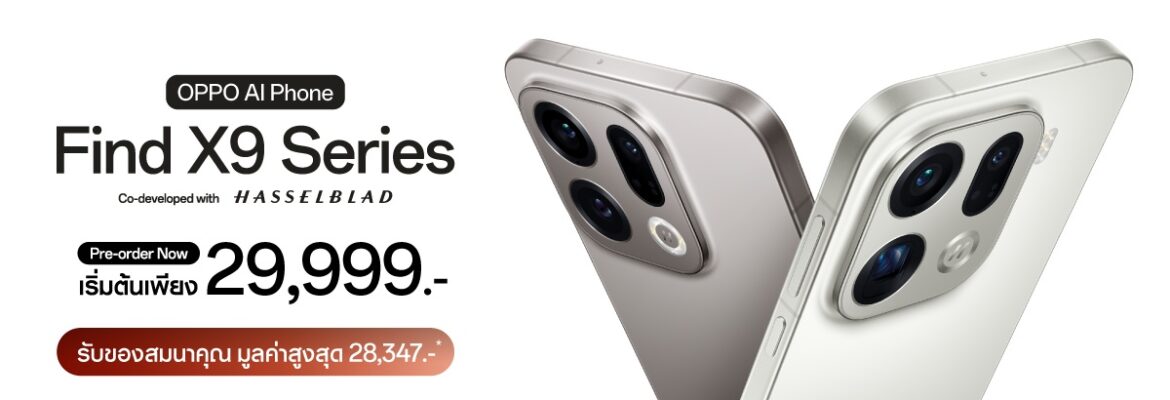 (กรุงเทพฯ – 29 ตุลาคม 2568) ออปโป้ ประเทศไทย เปิดตัวสมาร์ตโฟนแฟลกชิปรุ่นใหม่ล่าสุด “OPPO Find X9 Series” สมาร์ตโฟน “ซูมดีทุกคอนเสิร์ต” ที่ครบเครื่องทั้งภาพนิ่งและวิดีโอระดับโปรในเครื่องเดียว ด้วยเทคโนโลยีกล้อง Hasselblad Telephoto ความละเอียดสูงสุด 200MP พร้อมพลังซูมไกล 120x Super Zoom และโหมด Stage Mode เก็บครบทุกอารมณ์และจังหวะของศิลปินด้วยวิดีโอคมชัดระดับ 4K 120fps สานต่อความร่วมมือกับ Hasselblad ยกระดับพอร์ตเทรตให้สีผิวธรรมชาติ มีมิติ แสง และโทนสีสมจริงในทุกช็อตผ่านโหมด Hasselblad Portrait ทำงานลื่นไหลยิ่งกว่าเคยด้วยระบบปฏิบัติการ ColorOS 16 ใหม่ล่าสุด บนดีไซน์ใหม่สะท้อนความพรีเมียมทุกองศา ขอบหน้าจอบางเฉียบ จับถนัดมือ เปิดตัวพร้อมกัน 2 รุ่น ได้แก่ OPPO Find X9 Pro ในราคา 42,999 บาท และ OPPO Find X9 ในราคาเริ่มต้น 29,999 บาท พร้อมหูฟังไร้สายระดับแฟลกชิป OPPO Enco X3s ในราคา 4,999 บาท สัมผัสได้แล้ววันนี้ ณ OPPO Brand Shop ทุกสาขา และตัวแทนจำหน่ายทั่วประเทศ