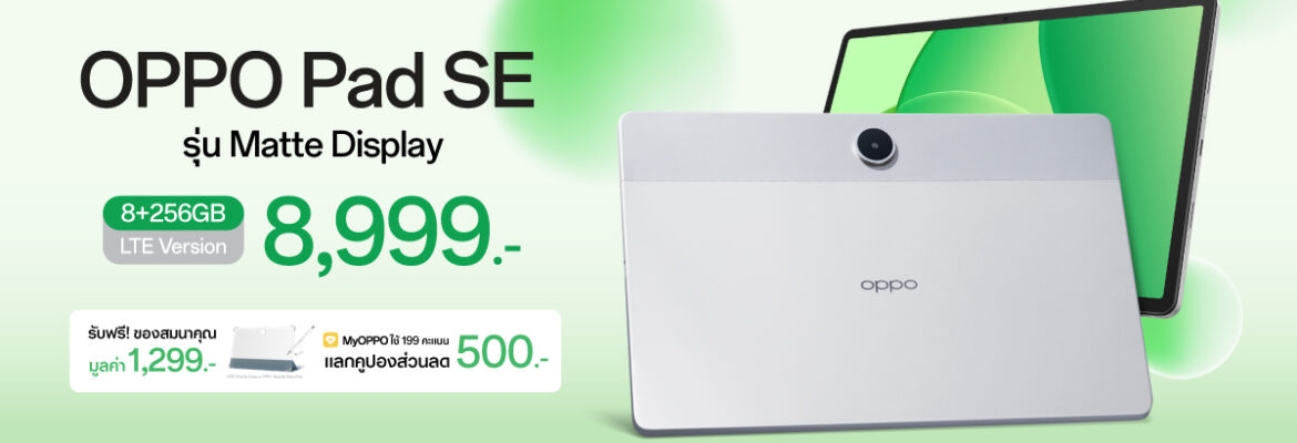28 พฤศจิกายน 2568 กรุงเทพฯ – OPPO ประกาศวางจำหน่าย “OPPO Pad SE รุ่น Matte Display” แท็บเล็ตสุดคุ้มค่า  ตอบโจทย์ทุกเรื่องของการใช้งานได้ทุกที่ทุกเวลาที่มาพร้อมกับการใส่ซิม ทำให้การใช้งานไม่สะดุด ลื่นไหล ตอบโจทย์ทุกสถานการณ์ ที่พร้อมมอบการใช้งานสุดสมาร์ท พร้อมมอบความบันเทิงไร้ขีดจำกัด สนุกตลอดวัน อย่างเป็นทางการในประเทศไทย OPPO Pad SE มาพร้อมความจุใหม่ 8+256GB ในราคาเพียง 8,999 บาทเท่านั้น! อีกทั้งยังรับฟรี OPPO TechLife Stylus Pen และ OPPO Pad SE Case Blue รวมมูลค่า 1,299 บาท พร้อม MyOPPO คูปอง ส่วนลด 500 บาท!