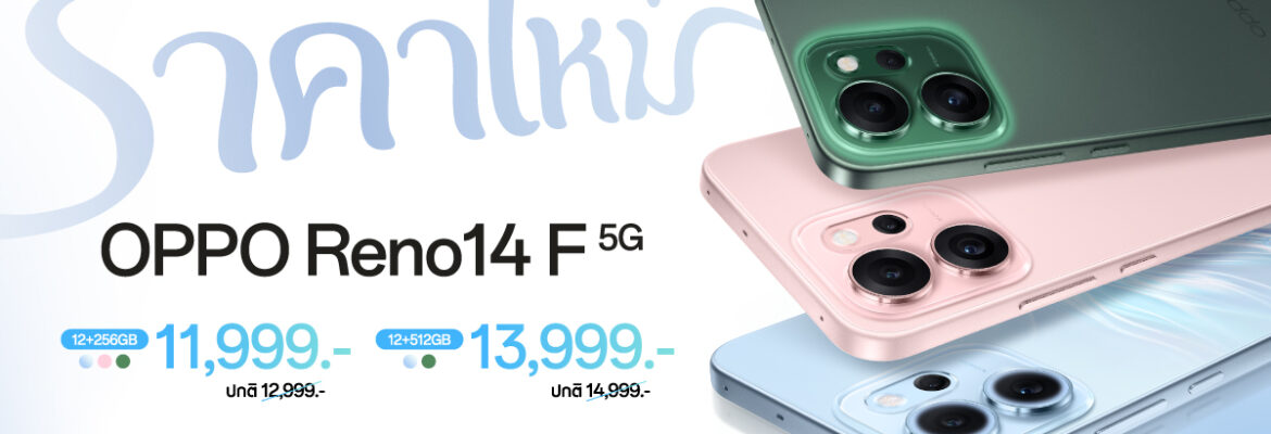 10 ตุลาคม 2568 กรุงเทพฯ – OPPO Reno14 F 5G สมาร์ตโฟนที่อัปเกรดประสบการณ์ The AI Portrait Expert ถ่ายพอร์ตเทรตสวยด้วยการอัปเกรดไปอีกขั้น พร้อมมอบประสบการณ์ใช้งานที่คุ้มในราคาที่คุ้มค่ายิ่งขึ้น OPPO Reno14 F 5G (12+256GB) มาในราคาใหม่สุดพิเศษ 11,999 บาท จากราคาปกติ 12,999 บาท และพิเศษยิ่งกว่านั้น OPPO Reno14 F 5G (12+512GB) มาในราคาใหม่ 13,999 บาท จากราคาปกติ 14,999 บาท ตั้งแต่วันที่ 10 ตุลาคม 2568
