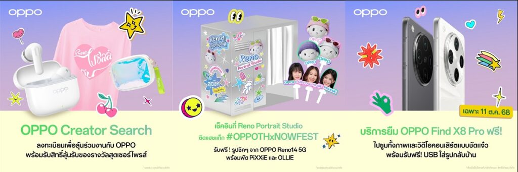 - OPPO Photobooth & Photo Corner: มาถ่ายรูปสวยๆ ด้วยสมาร์ตโฟน OPPO Reno14 Series 5G เพื่อเก็บภาพโมเมนต์สุดประทับใจ และรับของรางวัลสุดพิเศษจาก OPPO กลับบ้านไปเลย!
