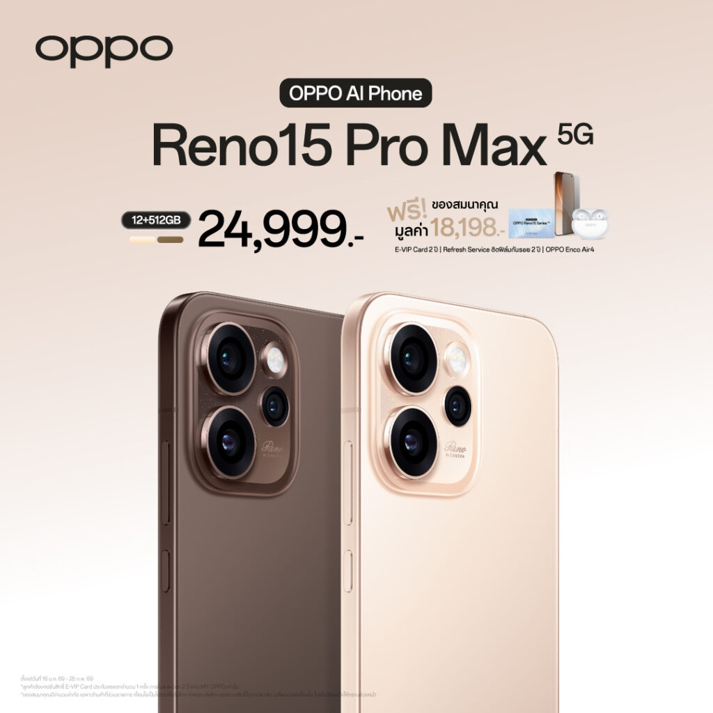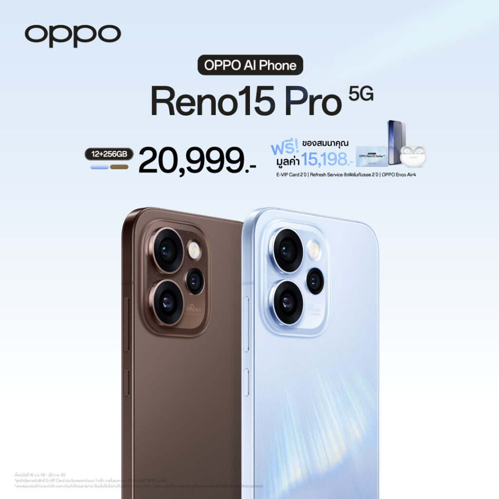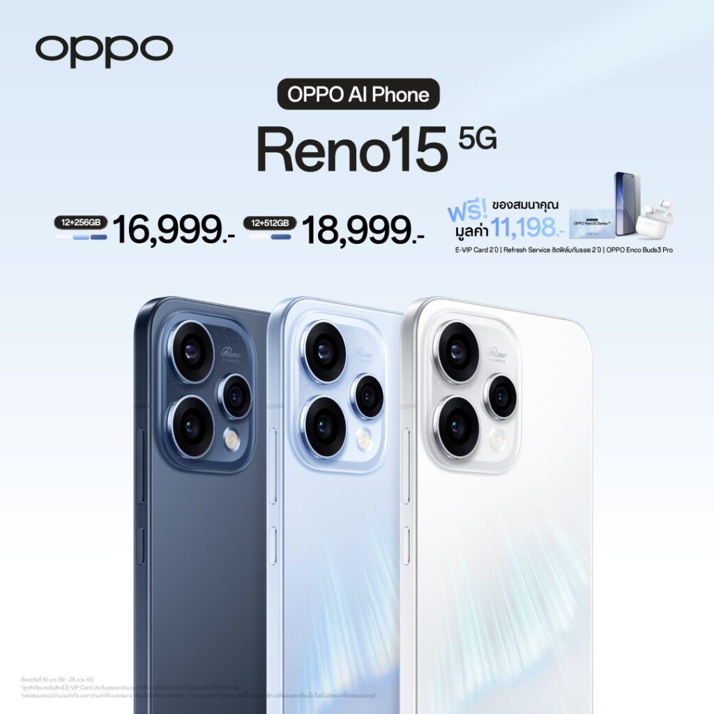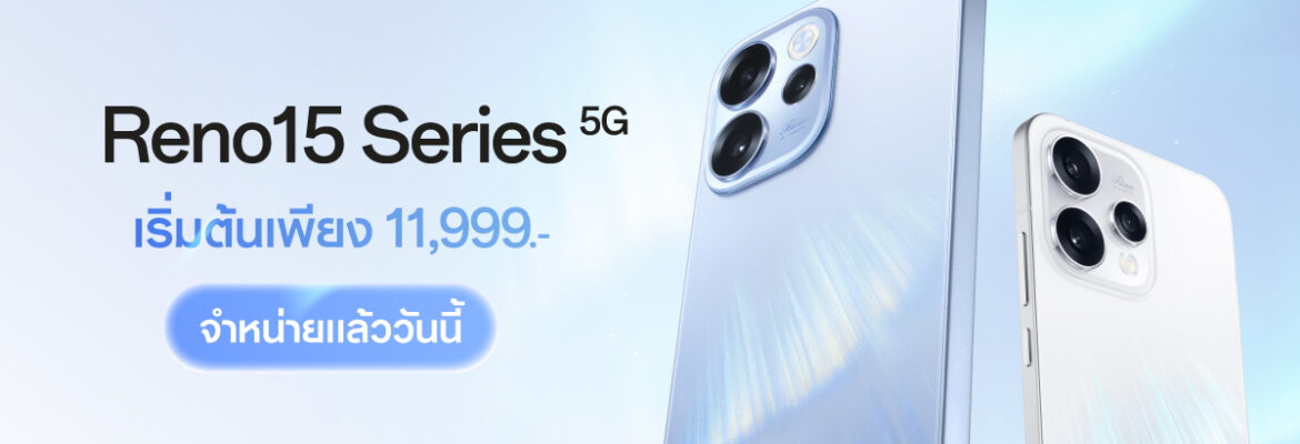 กรุงเทพฯ, 16 มกราคม 2569 – OPPO ประกาศวางจำหน่าย “OPPO Reno15 Series 5G” สมาร์ตโฟนเพื่อนซี้ เทรนดี้ทุกช็อต รุ่นใหม่ล่าสุด วางจำหน่ายในราคาสุดคุ้ม เริ่มต้นเพียง 11,999 บาท มาพร้อมโปรโมชั่นสุดพิเศษในช่วงวันนี้ – 28 กุมภาพันธ์ 2569 อีกทั้งยังมอบทุกประสบการณ์การใช้งานด้วย 2 ผลิตภัณฑ์ IoT ใหม่ อย่าง OPPO Watch S วางจำหน่ายในราคาเริ่มต้น 5,999 บาท และ OPPO Pad 5 ในราคาเริ่มต้น 13,999 บาท