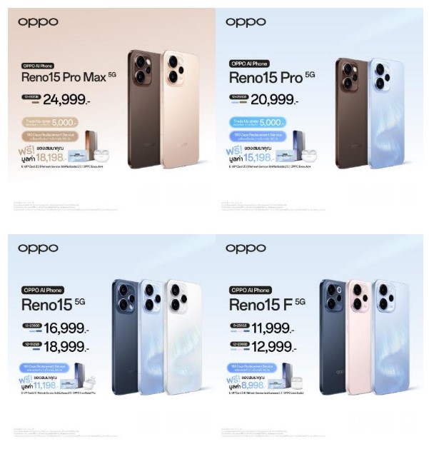 - OPPO Reno15 Pro 5G (12+256GB) วางจำหน่ายในราคา 20,999 บาท