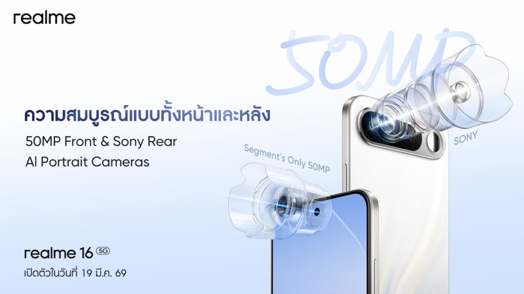 กรุงเทพฯ 16 มีนาคม 2569 – realme (เรียลมี) แบรนด์สมาร์ตโฟนเพื่อคนรุ่นใหม่ที่เติบโตเร็วที่สุดในโลก ประกาศเตรียมเปิดตัว “realme 16 5G series” สมาร์ตโฟนรุ่นใหม่ล่าสุดที่มาพร้อมโมดูลกล้องระดับแฟล็กชิปภายใต้ดีไซน์ “Camera Bar”ที่มาพร้อมกระจก Selfie Mirror ในตัวครั้งแรกในอุตสาหกรรมมือถือ บนพื้นฐานการออกแบบ Air Design ที่ผสานนวัตกรรมกล้องถ่ายภาพ ดีไซน์ที่มีเอกลักษณ์ และความบางเบาสุดคอมแพกต์ไว้อย่างลงตัว ทำให้ realme 16 5G  พร้อมตอบโจทย์ผู้ใช้ทุกไลฟ์สไตล์ ทั้งการถ่ายภาพแนวสร้างสรรค์ ตัวเครื่องที่สวยงามทุกมุมมอง และการใช้งานที่ลื่นไหลสะดวกสบายในทุกวัน