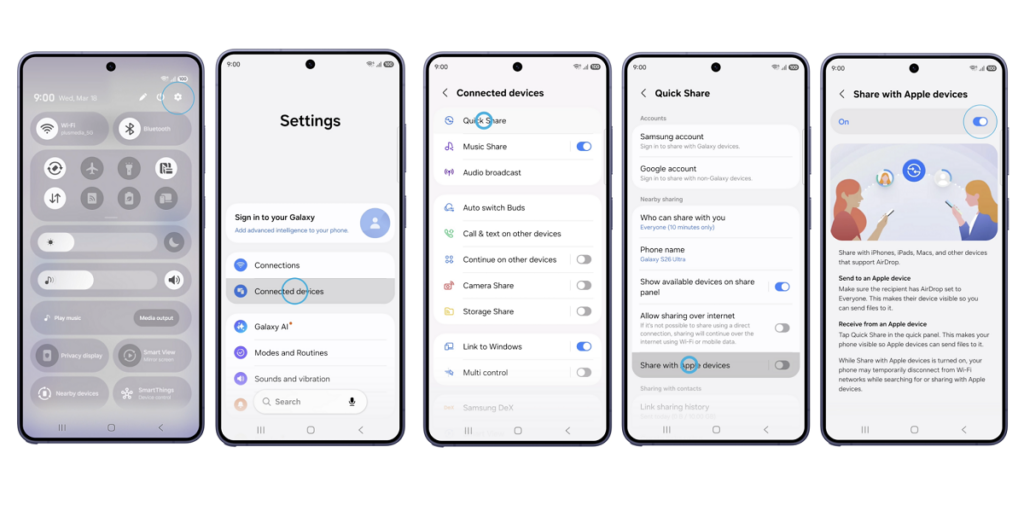 ความสามารถในการรองรับ AirDrop ผ่าน Quick Share จะพร้อมใช้งานบน Galaxy S26 Series ก่อน โดยซัมซุงระบุว่าจะมีการประกาศการขยายการรองรับไปยังอุปกรณ์รุ่นอื่นเพิ่มเติมต่อไป