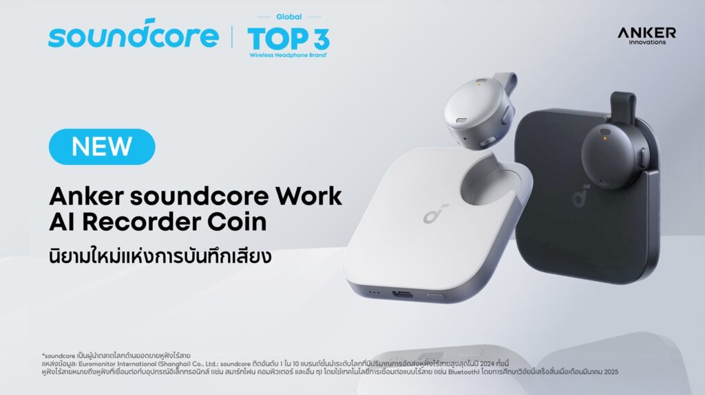 กรุงเทพฯ – 23 กุมภาพันธ์ 2569 – soundcore ประกาศเปิดตัวนวัตกรรมล่าสุด Anker soundcore Work – AI Recorder Coin ในประเทศไทยอย่างเป็นทางการวันนี้ ถือเป็นก้าวสำคัญของการพัฒนาเทคโนโลยีอัจฉริยะจากทางแบรนด์ soundcore พร้อมตอกย้ำความมุ่งมั่นในการสนับสนุนกลุ่มคนทำงานระดับมืออาชีพและเหล่าครีเอเตอร์ ด้วยนวัตกรรมที่ช่วยเพิ่มประสิทธิภาพการทำงานให้คล่องตัวและชาญฉลาดยิ่งกว่าเดิม