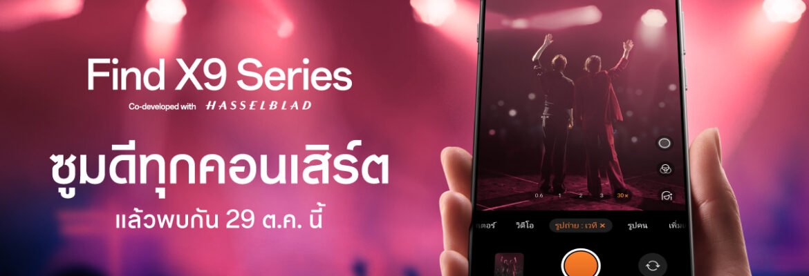 21 ตุลาคม 2568 กรุงเทพฯ – ออปโป้ ไทยแลนด์ ตอกย้ำประสบการณ์ใช้งานที่เหนือกว่า เตรียมส่งสมาร์ตโฟนแฟลกชิปที่สุดแห่งปี OPPO Find X9 Series สมาร์ตโฟนซูมดีทุกคอนเสิร์ต ด้วยการมาของกล้อง 200MP Hasselblad Telephoto คมชัดทุกการถ่ายภาพ ตอบโจทย์ทุกสายคอนเสิร์ต มาพร้อมดีไซน์ใหม่สะท้อนความพรีเมียมในทุกสัมผัส ด้วยขอบหน้าจอบางเฉียบ จับถือถนัดมือ พร้อมปล่อยวิดีโอตัวอย่างซูมคอนเสิร์ตด้วยกล้อง 200MP Hasselblad Telephoto และพลังซูมไกล 120x Super Zoom