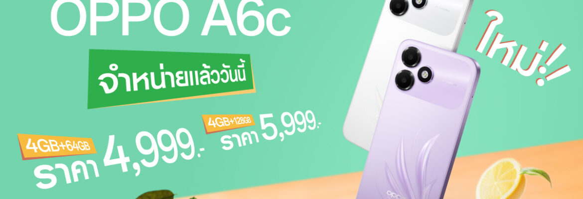 กรุงเทพฯ, 7 เมษายน 2569 – OPPO ประกาศวางจำหน่ายอย่างเป็นทางการในประเทศไทยแล้วกับ “OPPO A6c” สมาร์ตโฟนรุ่นใหม่ล่าสุดจากตระกูลซีรีส์ A ที่มาภายใต้สโลแกน “A Step Ahead” สมาร์ตโฟนคู่หูที่มาพร้อมความทนทาน ดีไซน์โดดเด่น น้ำหนักเบา พกพาสะดวก มาพร้อม 2 ความจุ ได้แก่ OPPO A6c (4+64GB) ในราคาเพียง 4,999 บาท และ OPPO A6c (4+128GB) ในราคาเพียง 5,999 บาท