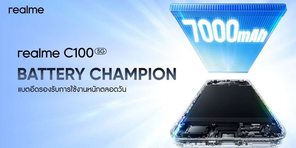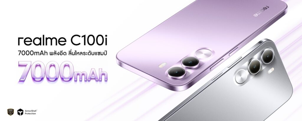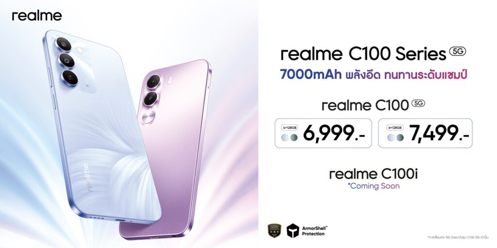 กรุงเทพฯ 3 เมษายน 2569 – realme (เรียลมี) แบรนด์เทคโนโลยีเพื่อคนรุ่นใหม่ที่เติบโตเร็วที่สุดในโลก ประกาศเปิดตัวสมาร์ตโฟนสองรุ่นใหม่ใน C100 Series ทั้ง “realme C100 5G” และ “realme C100i” ที่ถูกพัฒนามาเพื่อสร้างมาตรฐานใหม่ในตลาดสมาร์ตโฟนระดับเริ่มต้น มาพร้อมกับสโลแกน “พลังอึด ทนทานระดับแชมป์” โดยเป็นสมาร์ทโฟนประสิทธิภาพสูงที่คุ้มค่าเกินราคาสุด ๆ ด้วยแบตเตอรี่ยักษ์แบบ Titan ความจุ 7000mAh ที่ออกแบบให้ยืนระยะนานถึง 6 ปี พร้อมปกป้องตัวเครื่องด้วยมาตรฐานระดับทหาร และฟีเจอร์ AI ที่พบเฉพาะในรุ่นเรือธง ซึ่งผู้ใช้จะได้ฟีเจอร์ทั้งหมดนี้ในราคาหลักพันเท่านั้น! โดยเฉพาะรุ่นใหญ่อย่าง C100 5G จะเน้นที่ประสิทธิภาพและความสามารถของเครือข่าย 5G เต็มรูปแบบ ส่วนรุ่นน้องอย่าง C100i ตอบโจทย์ผู้ใช้งานที่ต้องการฟีเจอร์ครบครันในราคาที่เข้าถึงได้ยิ่งขึ้น