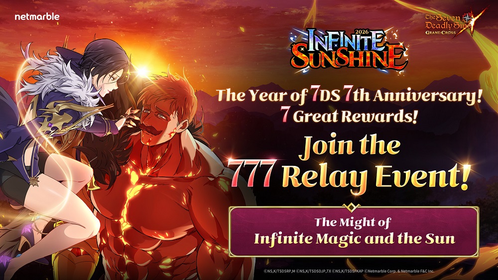 กรุงเทพฯ, ประเทศไทย (วันที่ 26 ธันวาคม พ.ศ. 2568) – เน็ตมาร์เบิ้ล ผู้พัฒนาและผู้เผยแพร่เกมคุณภาพสูงชั้นนำ ประกาศถึงอัปเดต New Year Festival 2026: Infinite Sunshine สำหรับเกม The Seven Deadly Sins: Grand Cross โดยอัปเดตในครั้งนี้มีอัศวินคู่ UR ใหม่, คอนเทนต์ตามฤดูกาลใหม่, และเริ่มต้นกิจกรรมครบรอบระยะยาวอย่างแคมเปญรีเลย์ 777 เกมเริ่มต้นปีใหม่ด้วยรางวัลที่เพิ่มขึ้น พร้อมโอกาสในการสุ่มตัวละครพิเศษและประสบการณ์เนื้อเรื่องใหม่สำหรับผู้เล่นทุกท่าน