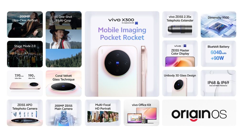 vivo X300 Series มาพร้อมการยกระดับประสบการณ์การใช้งานอย่างสมบูรณ์แบบ เริ่มจากระบบปฏิบัติการใหม่ OriginOS 6 ที่พลิกโฉม UI ให้ทันสมัยและสะดวกสบายตา พร้อมอัปเกรด AI Integration เต็มรูปแบบเพื่อเพิ่มความเร็วและความลื่นไหลในการทำงานและจัดการหน่วยความจำ ภายในผสานพลังจากชิปเซ็ตหลัก Dimensity 9500 และ vivo Imaging Chip V3+ เพื่อการประมวลผลอย่างรวดเร็วโดยใช้พลังงานต่ำ รองรับการใช้งานตลอดวันด้วยแบตเตอรี่ขนาดใหญ่ 6040mAh บน X300 และ 6510mAh บน X300 Pro และเทคโนโลยีชาร์จไว 90W FlashCharge แบบมีสายและ 40W FlashCharge ไร้สาย พร้อมรับรองสุขภาพแบตเตอรี่ 5 ปี นอกจากนี้ ตัวเครื่องยังทนทานสำหรับการใช้งานในทุกสถานการณ์ด้วยมาตรฐาน IP68 & IP69 ทนน้ำทนฝุ่น เสริมความแข็งแกร่งด้วยฝาหลังกระจกกันกระแทกระดับโปร ที่ผ่านการทดสอบการตกกระแทกตามมาตรฐาน
