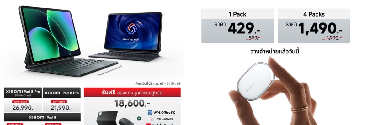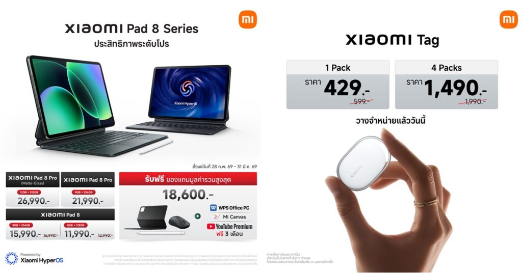 Xiaomi Pad 8 Series วางจำหน่ายแล้ววันนี้ 2 รุ่น ได้แก่ Xiaomi Pad 8 Pro และ Xiaomi Pad 8 โดยจัดโปรโมชันพิเศษ เมื่อซื้อ Xiaomi Pad 8 Series รุ่นใดก็ได้ระหว่างวันที่ 28 กุมภาพันธ์ 2569 ถึง 31 มีนาคม 2569 รับฟรี! ปากกา Xiaomi Focus Pen Pro, เคส Xiaomi Pad 8/ 8 Pro Cover, WPS Office PC, Mi Canvas และ YouTube Premium ฟรี 3 เดือน มูลค่ารวมสูงสุด 18,600 บาท36 ที่ Xiaomi Store และร้านตัวแทนจำหน่ายที่ร่วมรายการทั่วประเทศ รวมถึงช่องทางการจัดจำหน่ายทางออนไลน์แพลตฟอร์ม mi.com, Lazada, Shopee และ TikTok Shop34